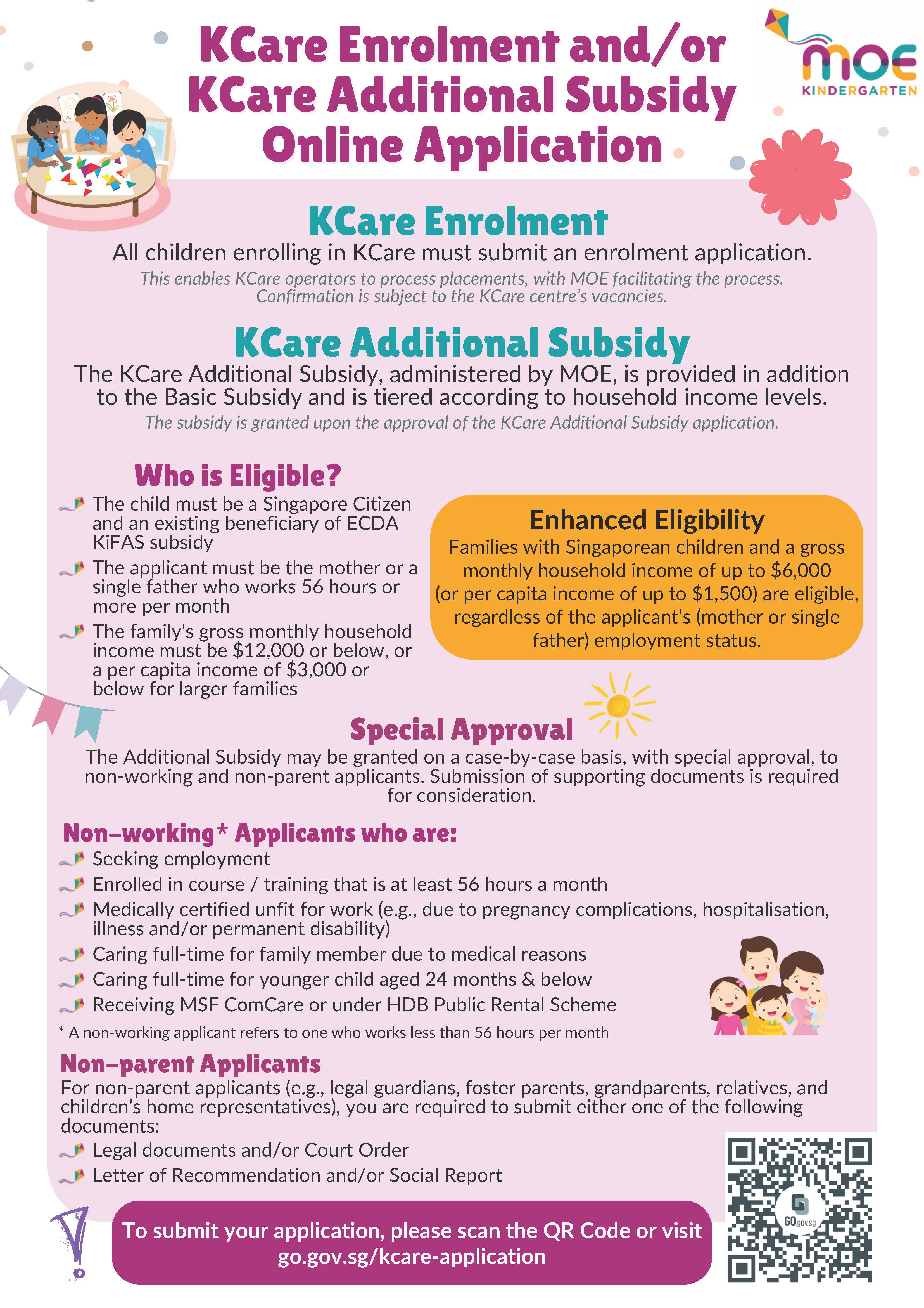 You may utilise the KCare Eligibility Calculator available on the MOE website to determine if your child qualifies for the KCare additional subsidy: